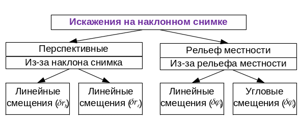 Геометрическое искажение изображения фотографируемых участков местности на снимках вызывается в основном значительными неровностями рельефа и отклонением оптической оси камеры от отвесной линии, то есть наклоном снимка относительно горизонтальной плоскости. В зависимости от этого различают на снимках искажения за рельеф и искажения за наклон снимка (рисунок 0).