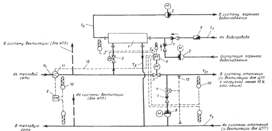 1 - водоподогреватель горячего водоснабжения; 2 - повысительно-циркуляционный насос горячего водоснабжения (пунктиром - циркуляционный насос); 3 - регулирующий клапан с электроприводом; 4 - регулятор перепада давлений (прямого действия); 5 - водомер для холодной воды; 6 - регулятор подачи теплоты на отопление, горячее водоснабжение и ограничения максимального расхода сетевой воды на ввод; 7 - обратный клапан; 8 - корректирующий подмешивающий насос; 9 - теплосчетчик; 10 - датчик температуры; 11 - датчик расхода воды; 12 - сигнал ограничений максимального расхода воды из тепловой сети на ввод; 13 - датчик давления воды в трубопроводе