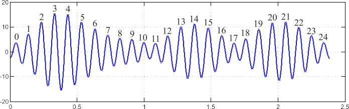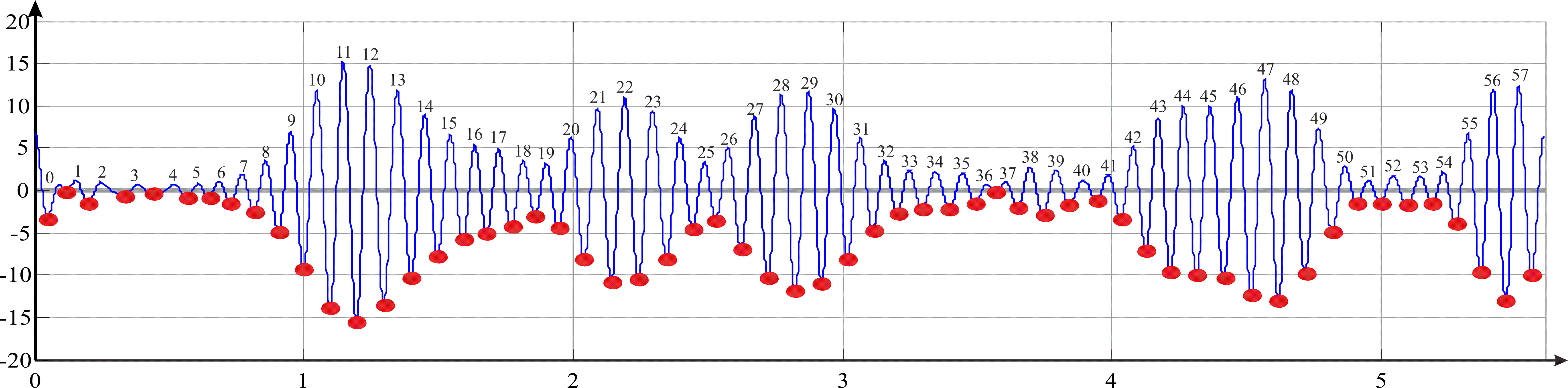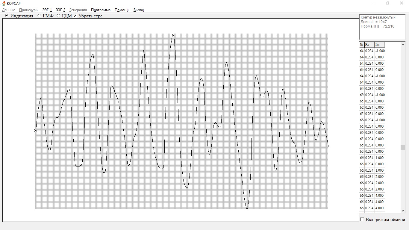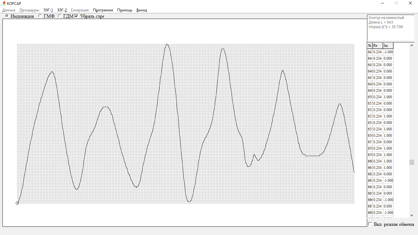 Сигнал мю-ритма, отфильтрованного в альфа диапазоне, был подвергнут сегментации. Каждый импульс имеет свой порядковый номер (см. рис. 4). Для доступа к коду отдельного импульса в среде КОРСАР в меню ЭЭГ необходимо выбрать команду Ввод, далее выбрать файл мю_ритм_в_альфа_диапазоне _N.txt, где N – номер импульса. После выбрать команду Преобразовать в контур в меню ЭЭГ.