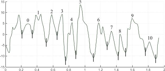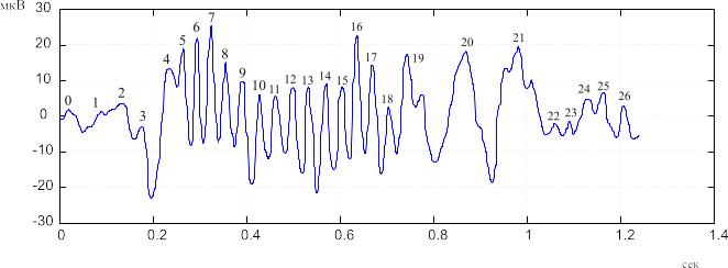 Сигнал, содержащий К-комплекс, был подвергнут сегментации. Каждый импульс имеет свой порядковый номер (см. рис. 1). Для доступа к коду отдельного импульса в среде КОРСАР в меню ЭЭГ необходимо выбрать команду Ввод, далее выбрать файл к_комплекс _N.txt, где N – номер импульса. После выбрать команду Преобразовать в контур в меню ЭЭГ. (например для загрузки нулевого импульса необходимо выбрать файл к_комплекс_0.txt).