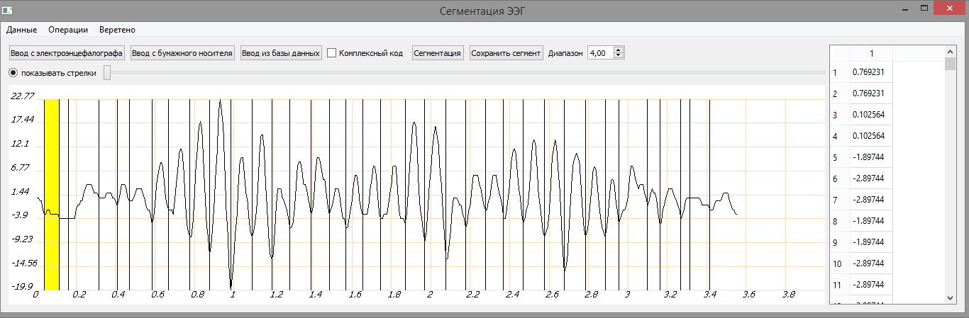 Сигнал первой эпохи и первого веретена был сегментирован. Каждый сегмент сохранен в собственный файл. Для доступа к файлам сегментов первой эпохи в среде КОРСАР необходимо выбрать команду ВВОД из меню ЭЭГ, далее выбрать один из файлов C4_1_segment_N, где N – номер сегмента в эпохе. Для доступа к сегментам первого веретена необходимо выполнить аналогичные действия, сегменты веретена хранятся под именами C4_1_alpha_N, где N – номер сегмента в веретене.