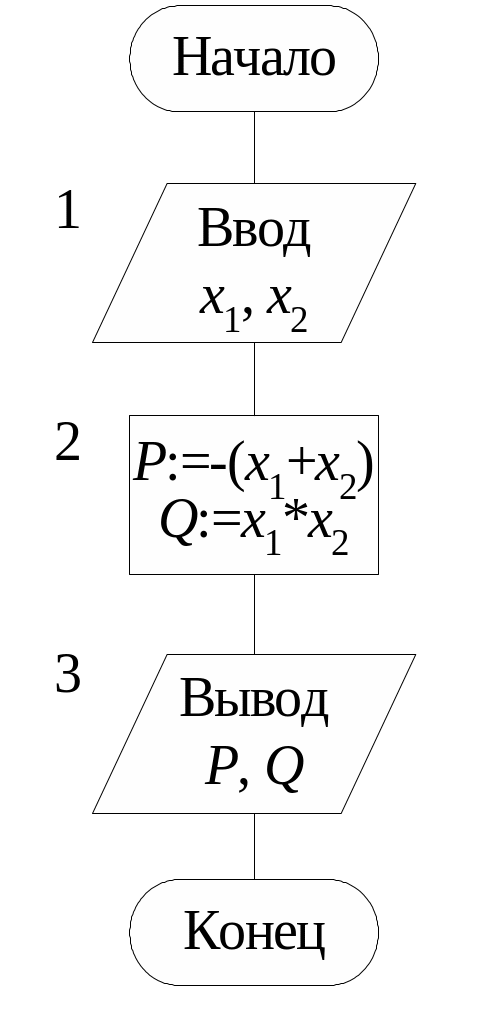 Пример Составим алгоритм вычисления коэффициентов приведенного квадратного уравнения x2 + px + q = 0, корни которого x1, x2 известны.