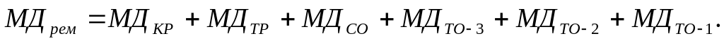 Время простоя в ремонтах и техобслуживании определяется умножением числа ремонтов и ТО на продолжительность их проведения. В связи с тем, что количество текущих ремонтов для основного лесозаготовительного оборудования не рассчитывается, время простоя в текущих простоях (МДТР) определяется путем деления объема работы парка машин на планируемый год (Zобщ) на 1000 км пробега или 100 мото-часов (маш.-часов) работы и умножения полученного результата на норматив времени простоя при проведении данного ремонта (tТР):
