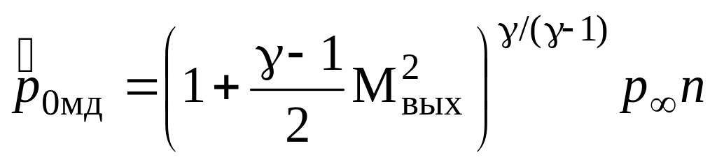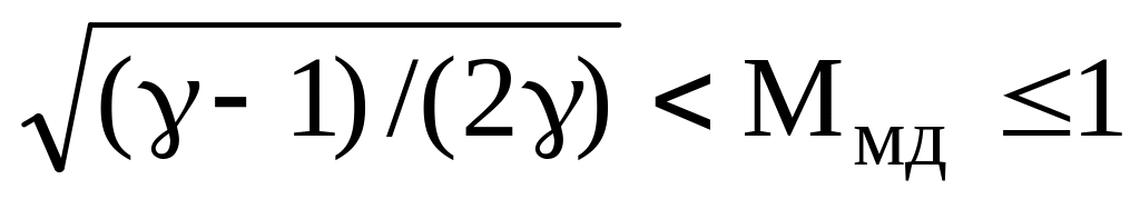 Определение параметров во внутренней подобласти. Параметры во внутренней подобласти вычисляются следующим образом. Предполагаем на основании имеющихся экспериментальных данных, что до значений чисел Маха на срезе сопла Мвых ≤ 4 поток за маховским диском ускоряется и в некотором сечении, называемом звуковым, скорость потока достигает скорости звука, а статическое давление сравнивается с величиной . Тогда, совмещая звуковое сечение с сечением а–а и принимая во внимание постоянство полного теплосодержания в пределах первой бочки при отсутствии перемешивания с окружающей средой: