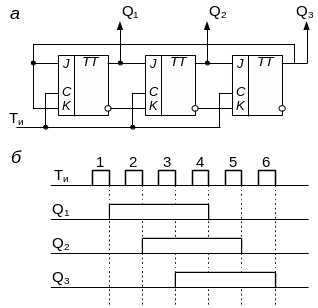 Рис. 5.8. Схема делителя частоты на 6 (а) и временная диаграмма его работы (б)
