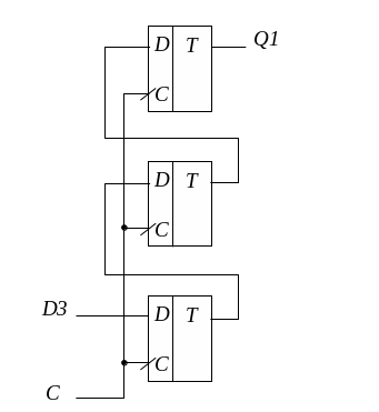 Рисунок 3.45 – Последовательный однонаправленный регистр на базе D-триггеров, синхронизированных передним фронтом