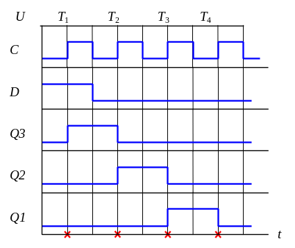 При записи в регистр двоичного слова А=а3а2а1а0 первый разряд вводимого слова (а0) подается на вход крайнего левого триггера (Т3), являющегося одновременно входом регистра в целом, и записывается в него при поступлении первого сигнала (импульса) синхронизации С. С приходом следующего сигнала синхронизации значение а0 с выхода разряда Q3 вводится в разряд Q2, а в разряд Q3 поступает а1.