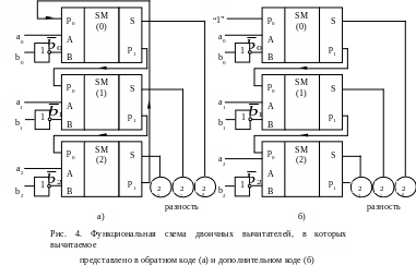 Чтобы схема работала как 3-разрядный вычитатель, на управляющем входе V нужно установить уровень логической 1. В этом случае логический элемент М2 действует как инвертор сигналов на входах B одноразрядных сумматоров. Кроме того, логическая 1 на управляющем входе поступает на вход переноса младшего разряда двоичного сумматора.