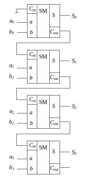 Для каждого разряда в этой схеме используется отдельный одноразрядный полный сумматор. В младший разряд (a0, b0) переноса нет, поэтому Сin=0. На каждый последующий разряд подеется перенос из предыдущего. Хоть сумматор и называется параллельным, на самом деле все разряды обрабатываются не точно одновременно, а только после формирования переноса для данного разряда. Отсюда следует, что быстродействие устройства определяется суммой задержек передачи сигнала переноса с младшего разряда на выход сумматора старшего разряда.