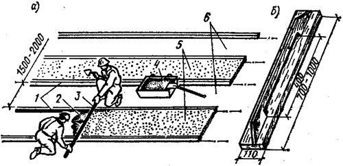 Рисунок 6. Устройство стяжки по маячным рейкам: а - разравнивание цементно-песчаного раствора; б - правило; 1 - маячная рейка; 2 - свежая полоса стяжки; 3 - правило; 4 - ящик с раствором; 5 - готовая стяжка; 6 - промежуточные полосы, заполняемые раствором после снятия маячных реек.