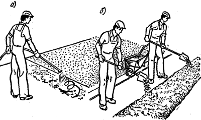 Рисунок 10. Устройство гравийного защитного слоя: а - нанесение мастики на поверхность кровли; б - рассеивание с помощью лопат гравия по слою мастики. Для наклейки рулонных материалов к основанию используют холодные и горячие мастики. Для горячих растворов характерна технология получения путем разогрева различными способами (в пламени горелки, нагреванием в чане и др.). Ее основным назначением является приклеивание гибких кровельных материалов на основе тех же битумов, создание гидроизоляционной обмазки на элементах конструкций. Для нанесения состава требуется разогрев до температуры около ста восьмидесяти градусов. Разогретый состав намазывается или наносится каким-либо иным способом на основание. Высокая адгезивность и текучесть в разогретом состоянии обеспечивают прочное сцепление и хорошую защиту поверхности нанесения. Очевидным недостатком работы с горячей мастикой будет необходимость дополнительного оборудования для ее разогрева. Сложность проведения работ возрастает на открытом воздухе в условиях пониженных температур В отличие от горячей, мастика битумная кровельная холодная приготавливается, как и все холодные растворы, с использованием различных растворителей. Ее можно использовать для выполнения работ без необходимости дополнительного разогрева, в «полевых» условиях, например, на строительной площадке даже в зимний период. Приготовление холодной мастики возможно с использованием бензина, керосина или других растворителей. На практике чаще всего применяется масло соляровое. Его подогревают в ходе приготовления состава и вводят в расплав битума вместе с наполнителями (чаще известь и асбест). Получаемый таким образом состав может использоваться в проводимых работах или храниться в закрытой таре (обязательное условие). |