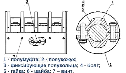 Продольно – свертные муфты состоят из двух половин с внутренними полуцилиндрическими поверхностями, охватывающими соединяемые валы. Полумуфты стянуты болтами, которые работают на растяжение. Это значит, что затяжка болтов обеспечивает возникновение сил трения между полумуфтами и валами, что дает возможность передавать крутящий момент. Сборка и разборка просты, требует строгой соосности , соединяемые валы должны быть одного диаметра.