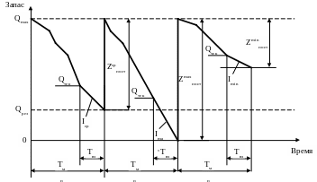 Резервный запас ресурса в рассматриваемой системе управления определяется исходя из того требования, что его величины должно хватить на весь период между очередными поставками в случае, если интенсивность потребления ресурса производством будет систематически превышать нормальный (средний) уровень. Размер такого резервного ресурса определяется по формуле: