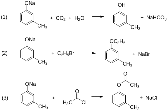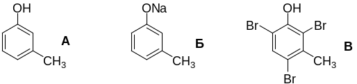 3) вещество В содержит 3 атома брома, тогда M(В) = 240/0,695 = 345 г/моль, на остаток помимо брома приходится 345 – 240 = 105 г/моль – решение имеется. Молекулярный вес 2,4,6-трибромфенола равняется 331 г/моль, что отличается от вещества В на 14 г/моль, т.е. на группу СН2. Вещество А – один из изомеров метилфенола, а именно 3-метилфенол (мета-крезол), поскольку только он может образовать трибромпроизводное.