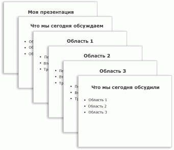 Если используется эта базовая структура, то при наличии трех основных представляемых тем или областей, можно планировать, что презентация будет содержать не менее шести слайдов: титульный слайд, вводный слайд, по одному слайду для каждой из трех основных тем или областей и итоговый слайд.