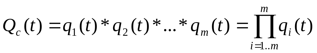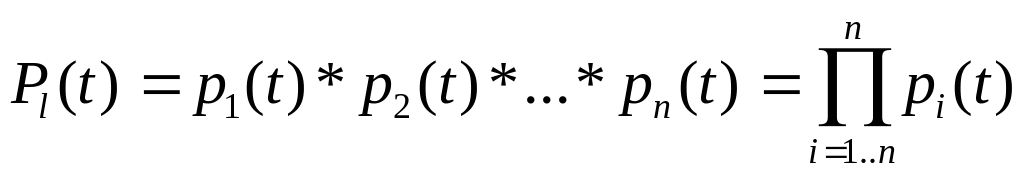 Поскольку при последовательном соединении элементов (рис. 1.13.. б) работоспособное состояние системы имеет место при совмещении работоспособных состояний всех элементов, то вероятность этого состояния системы определяется произведением вероятностей работоспособных состояний всех элементов. Если система состоит из n последовательно включенных элементов, то при вероятности безотказной работы каждого из элементов рi(t) вероятность безотказной работы системы Pc(t) равна