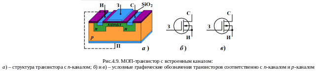 МОП-транзисторы могут быть двух типов: транзистор с встроенным каналом (канал создается при изготовлении) и транзистор с индуцированным каналом (канал возникает под действием напряжения, приложенного к затвору).