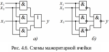 Рассмотрим пример. Пусть необходимо построить мажоритарную ячейку (называемую также схемой голосования) на три входа. Сигнал на выходе ячейки принимает значение, присутствующее на большинстве входов.