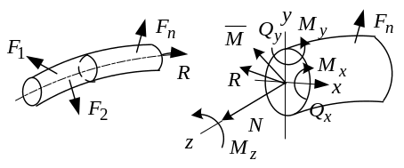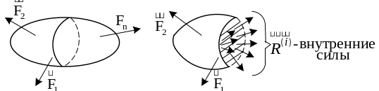 Сплошное тело не имеет частиц. Его сплошность обуславливается внутренними связями, распределенными сплошным образом. Рассечем тело некоторой поверхности на две части. Согласно аксиоме связей, можно действие связей, нарушенных при рассекании, заменить их реакциями. Эти силы и будут внутренними силами. Из принципа отвердевания следует, что условия равновесия в данном случае будут теми же, что и для тела абсолютно твердого. Составляя уравнение статики для оставшейся части, обнаруживаем внутренние силы.