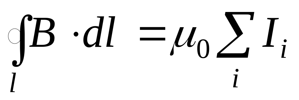 Теорема о циркуляции вектора магнитной индукции (случай постоянных токов): циркуляция вектора магнитной индукции по контуру, охватывающему систему токов, равна алгебраической сумме сил этих токов, умноженной на μ0: