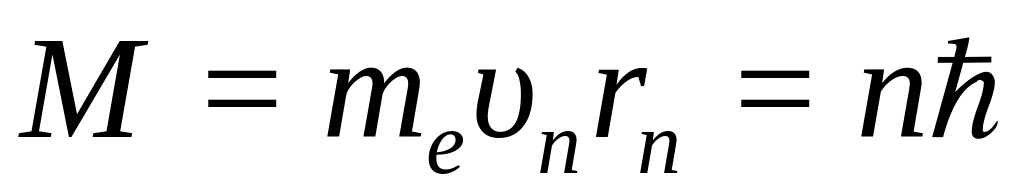 где mе – масса электрона; υn – скорость электрона на n-й орбите; rn – радиус n-й стационарной орбиты; n – номер стационарной орбиты; ħ − величина, связанная с постоянной Планка h соотношением ħ = h/ 2π, обычно также называемая постоянной Планка.