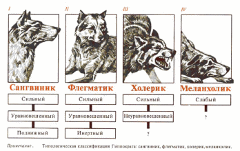 Эта классификация типов ВНД легко сопоставляется с широко принятой в психологии классификацией темпераментов (типов поведения) по Гиппократу: холерик, сангвиник, флегматик, меланхолик.