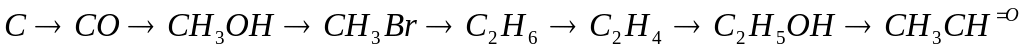 углерод → карбид алюминия → метан → оксид углерода (II) → формиат натрия → муравьиная кислота → углекислый газ