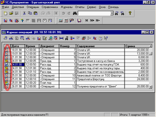 Самая левая графа журнала операций является служебной и отражает состояние операции.