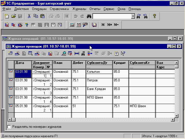 Оба журнала имеют возможности отбора операций проводок по различным критериям. В обоих журналах существует практически одинаковый набор действий для манипулирования операциями. Вызов режима ввода или редактирования операции, удаления операции и так далее. При этом все действия в журналах всегда выполняются на уровне целых операций.