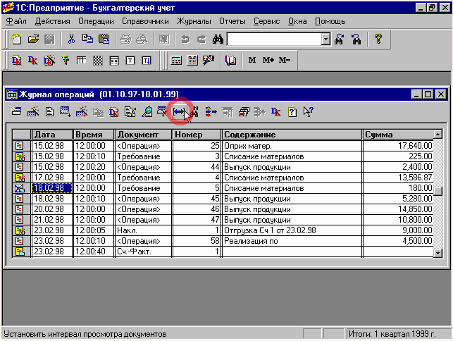 Текущий интервал видимости выводится в скобках после названия журнала. Интервал видимости устанавливается двумя способами: автоматически и вручную. Когда окно с журналом операций вызывается на экран интервал видимости автоматически устанавливается так как определено в настройке параметров журнала. Для изменения параметров видимости журнала необходимо выбрать пункт Интервал из меню Действияглавного меню программы или нажать эту копку на панели инструментов окна журналов.