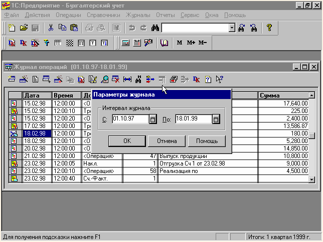 Внешний вид окна журнала операций задается на этапе конфигурирования. Тем не менее окно журнала операций имеет как правило ряд стандартных элементов. В заголовке журнала операций указывается интервал за который просматриваются операции в журнале. Если задано какое либо условие отбора, то оно также выводится в заголовке журнала операций.