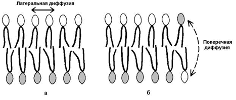 Рисунок 9.9. Виды перемещений фосфолипидных молекул в липидном бислое. 3) ограниченная способность к поперечной диффузии (переходу молекул из наружного слоя во внутренний и наоборот, см. рисунок 9.9, б), что способствует сохранению асимметрии – структурно-функциональных различий наружного и внутреннего слоёв мембраны. 4) непроницаемость замкнутого бислоя для большинства водорастворимых молекул. |