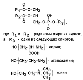 9.4.2. Большинство липидов в мембранах млекопитающих представлены фосфолипидами, гликосфинголипидами и холестеролом. Фосфолипиды в составе мембран подразделяются на две группы: глицерофосфолипиды и сфингомиелины. Глицерофосфолипиды – представляют собой сложные эфиры трёхатомного спирта глицерола, двух остатков жирных кислот и фосфорилированного аминоспирта. Общая формула глицерофосфолипида представлена на рисунке 9.5. Наиболее распространённым глицерофосфолипидом мембран является фосфатидилхолин: