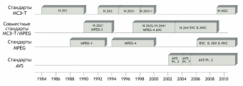 Движущей силой создания стандартов кодирования видеоинформации являются различные приложения и развитие их аппаратного обеспечения. Блочное гибридное кодирование является, по сути, ядром всех стандартов сжатия видео. Среди ранних стандартов можно перечислить H.261, MPEG-1, MPEG-2/H.262, H.263 и MPEG-4, часть 2 (рисунок 9.1).