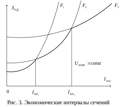 Экономические интервалы для различных стандартных сечений определенного класса напряжения получены при построении зависимости приведенных затрат в сооружение 1 км линии от тока. Вид зависимостей показан на рис. 3.