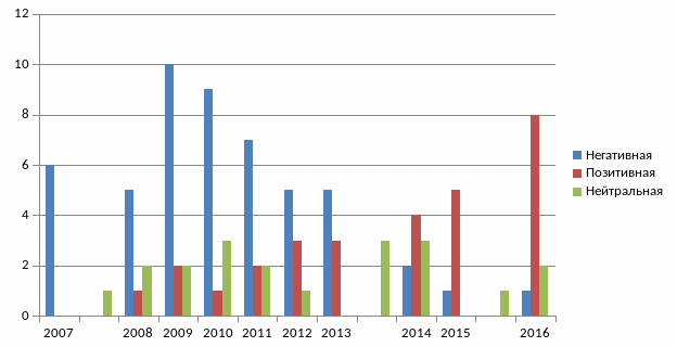 Рост позитивных оценок к 2016 году также вызван тем, что в СМИ появилось больше материалов об организациях и правовых актах, устанавливающих международные нормы гражданской авиации и координирующее её развитие с целью повышения безопасности и эффективности. Хоть и эти публикации носят нейтральный характер, то есть просто информируют граждан, в дальнейшем они позитивно складываются на уровне доверия граждан к авиационным перелётам. Этому свидетельствует показатели за 2007 год. Нейтральных сообщений медиа-материалов за этот год не было обнаружено в ходе исследования. Однако материалов, отражающих негативный характер, оказалось превеликое множество. Если посмотреть показатели за 2016 год, то можно обнаружить, что с увеличением количества публикаций, отражающих информирующий (нейтральный) характер, возросло количество положительных оценок психологического состояния пассажиров во время авиационных перелётов. Например, в Российской газете были опубликованы правила Воздушного кодекса Российской Федерации6, откуда граждане могут найти информацию о правовых основах использования воздушного пространства Российской Федерации и деятельности в области авиации, что повышает уровень доверия граждан нашей страны и их чувство безопасности во время авиационных перелётов.