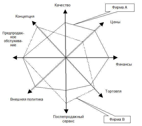 Оценка возможностей фирмы позволяет построить «многоугольник конкурентоспособности». Это достаточно известный метод, в основе которого лежит унифицированный подход к каждому конкуренту, позволяющий провести сравнительный анализ конкурентоспособности. Накладывая составленные для разных фирм схемы друг на друга, получают так называемый «радар конкурентоспособности». Данный метод позволяет наглядно увидеть сильные и слабые стороны одной фирмы по отношению к другой.