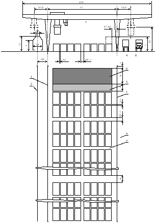1 – подкрановый путь; 2 – железнодорожный путь; 3 – проходы для приемосдатчиков; 4 – автопроезд; 5 – участок ремонта контейнеров; 6 – участок ремонта крана; 7 – козловый кран; 8 – автополуприцеп