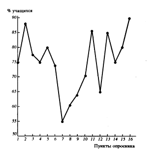1) изучение отношения к утверждению каждого пункта опросника у учащихся V-IX классов. Показателем положительного отношения к каждому утверждению или отрицанию является процент соответствующих ответов (согласен или не согласен);