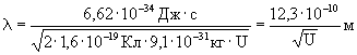 Найдем зависимость длины волны электрона от ускоряющего напряжения U электрического поля, в котором он движется. Изменение кинетической энергии электрона равно работе сил поля: