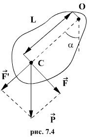 При небольших углах отклонения α (рис. 7.4) физический маятник так же совершает гармонические колебания. Будем считать, что вес физического маятника приложен к его центру тяжести в точке С. Силой, которая возвращает маятник в положение равновесия, в данном случае будет составляющая силы тяжести – сила F.