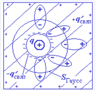 Пусть заряд +q окружен оболочкой из твердого диэлектрика. На рис. 1.37 показаны схематически несколько молекул диэлектрика. Они стремятся ориентироваться по полю этого заряда. Диэлектрик поляризуется, на внешней его поверхности возникает связанный заряд +qсвяз , на внутренней -qсвяз. Допустим, мы хотим найти напряженность поля в диэлектрике с помощью теоремы Гаусса. Выбираем гауссову поверхность в виде сферы. Она будет охватывать не только заряд +q, но и отрицательные связанные заряды, как бы «отсекая» часть молекулы. Теорема Гаусса для вектора напряженности при наличии диэлектрика запишется в виде: |