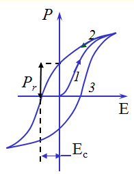 3. При изменениях поля значения поляризованности Р (а следовательно, и смещения D) отстают от напряженности поля Е, в результате чего Р и D определяются не только величиной Е в данный момент, но и предшествующими значениями Е, т. е. зависят от предыстории диэлектрика. Это явление называется гистерезисом (от греческого «гистерезис» – запаздывание). При циклических изменениях поля зависимость Р от Е изображается кривой, называемой петлей гистерезиса (рис. 1.42). При первоначальном включении поля поляризованность растет с Е в соответствии с ветвью 1 кривой. Уменьшение Р происходит по ветви 2. При обращении Е в нуль вещество сохраняет значение поляризованности Рr, называемое остаточной поляризованностью. Только под действием противоположно направленного поля напряженности Есполяризованность ставится равной нулю. Это значение напряженности называется коэрцитивной силой. При дальнейшем изменении Е получается ветвь 3 петли гистерезиса. Поведение поляризованности сегнетоэлектриков аналогично поведению намагниченности ферромагнетиков. По этой причине сегнетоэлектрики называют иногда ферроэлектриками.