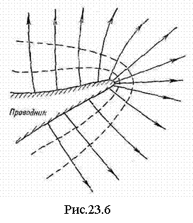 Электрические заряды по поверхности проводника распределяются неравномерно: поверхностная плотность заряда больше на выпуклостях и меньше на впадинах. Линии напряжённости всегда перпендикулярны эквипотенциальной поверхности проводника и сгущаются на острие, где зарядов больше (рис.23.6) .