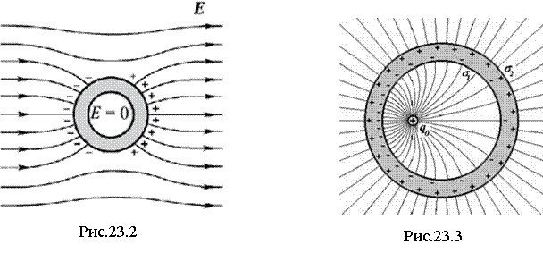 Поверхность проводника – эквипотенциальная, поэтому линии напряжённости к ней перпендикулярны (рис.23.1, б), а индуцированные на поверхности проводника свободные заряды разрывают линии напряжённости, так что внутри проводника поля нет.