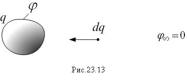 Будем заряжать уединённый проводник, перемещая из бесконечности на него заряд (рис.23.13).