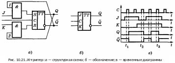 JK-триггер. JK-триггеры (читается «джи-ка» триггеры)1 являются наиболее универсальными: в них входы J и K (подобно входам R и S) задают желательное состояние, но, в отличие от RS-триггеров, допустим набор J = 1, K = 1. По принципу действия JK-триггеры относятся к категории синхронных, т. е. их выходные уровни устанавливаются только при поступлении тактовых импульсов С. Структура, символ и временная диаграмма JK-триггера показаны на рис. 10.21.
