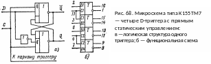 В интегральном исполнении D-триггеры выпускаются в нескольких сериях интегральных микросхем. Примером D-триггеров со статическим управлением могут служить микросхемы типа К155ТМ7 и К155ТМ5. В одном корпусе содержится четыре D-триггера с самостоятельными входами и выходами. Синхронизирующих входов два —по одному на два триггера (рис. 68). Микросхема К155ТМ5 отличается от К155ТМ7 отсутствием выводов от инверсных выходов .