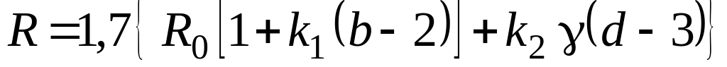 где R0 - условное сопротивление грунта несущего слоя основания (значения R0 были рассчитаны в подразделе 1.2), кПа; k1 и k2 - табличные коэффициенты (см. подраздел 1.2); 9,81 - средний в пределах глубины заложения d удельный вес грунта. кН/м3, - средняя плотность грунта в пределах той же глубины, допускается принимать равной 2 т/м3 или определять по формуле: