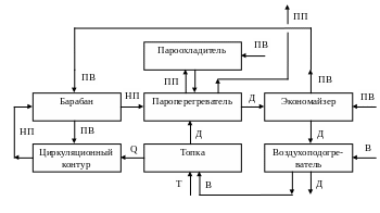 На рис. 2.2 наведена загальна структурна схема барабанного парового котла, що розглядається, яка відображає основні елементи котла і рух основних потоків між ними.